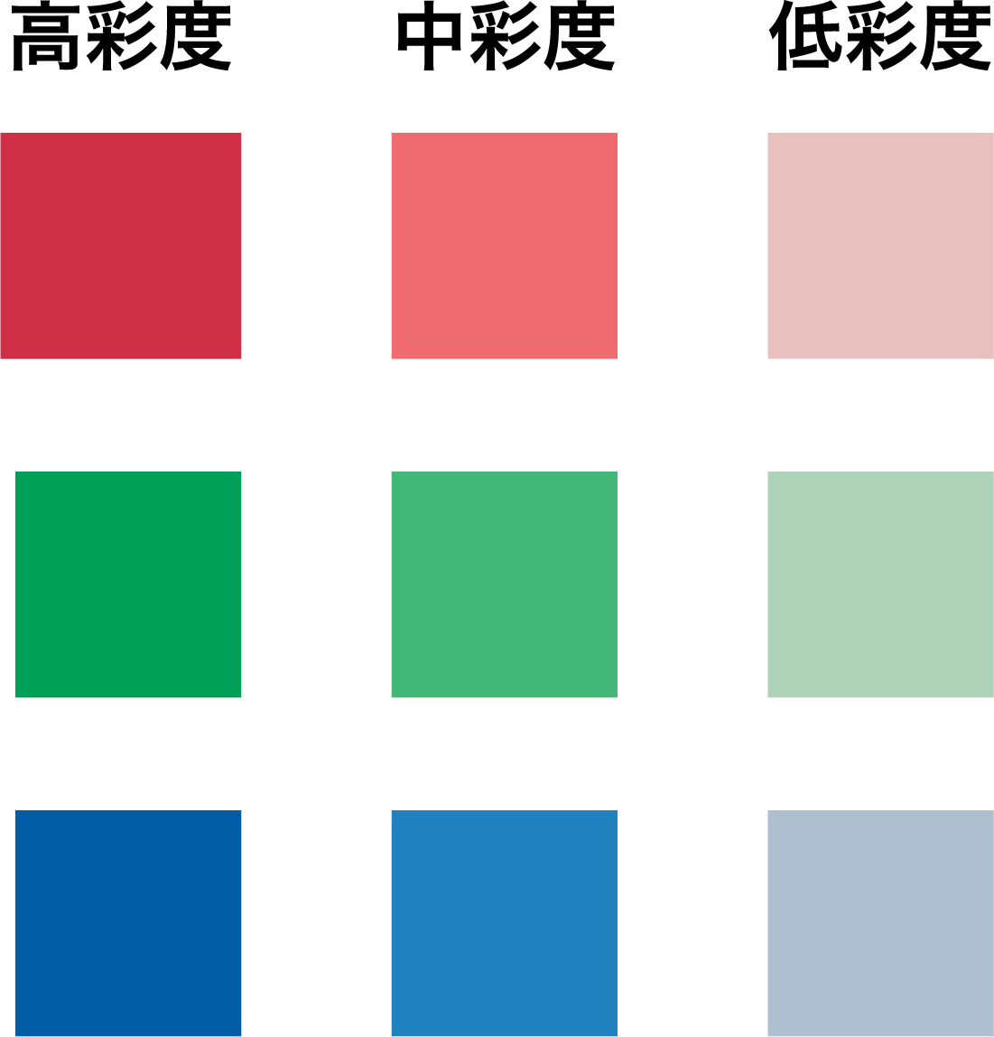 彩度は高彩度色、中彩度色、低彩度色の三つに大きく分けることができます。