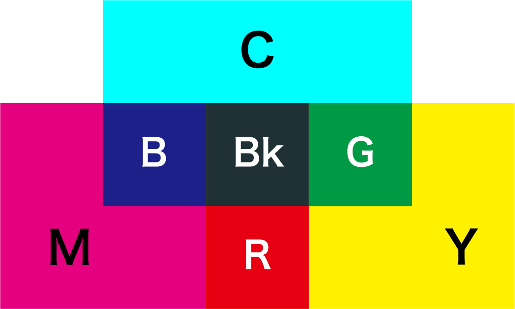 C(シアン)、M(マゼンタ)、Y(イエロー)減法混色の三原色 C(青緑:cyan) 長波長の光(R)を吸収する M(赤紫:magenta) 中波長の光(G)を吸収する Y(黄:yellow) 短波長の光(B)を吸収する