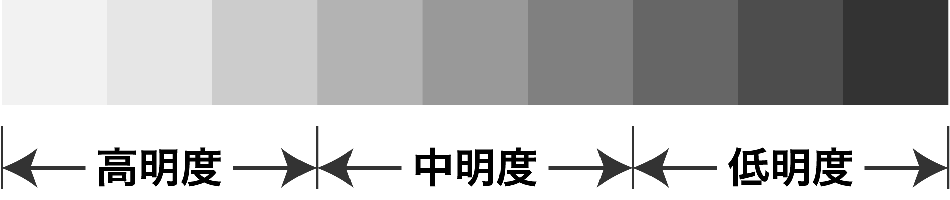 明度は高明度、中明度、低明度の三つに大きく分けることができます。