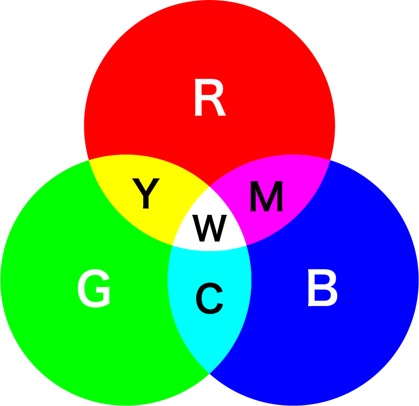 R(赤)、G(緑)、B(青)加法混色の三原色 R(赤:red) 長波長の光 G(緑:green) 中波長の光 B(青:blue) 短波長の光