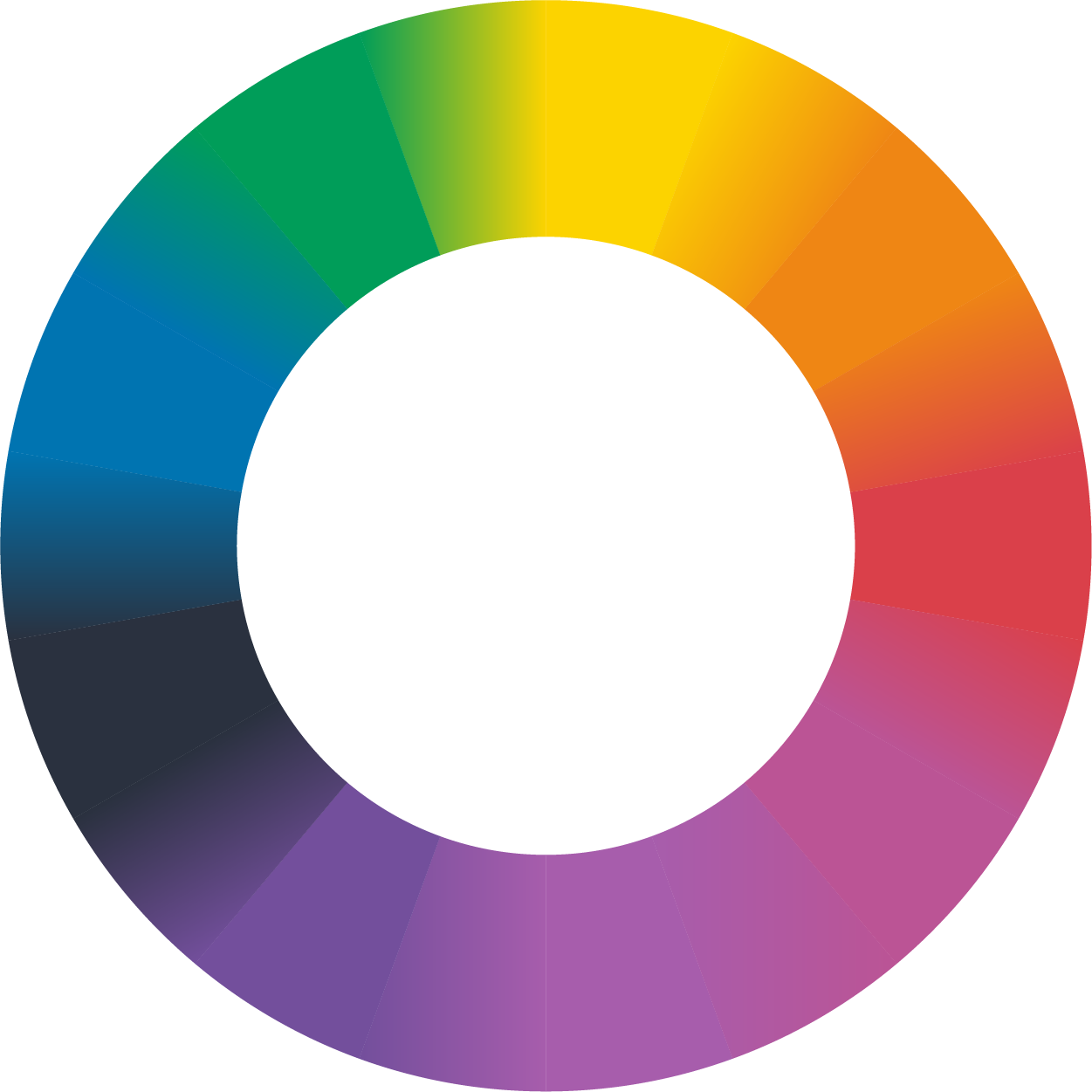 紫、赤紫を補って、両端を丸くつないで輪にすると、色相が連続して変化して見える色相環という環ができます。