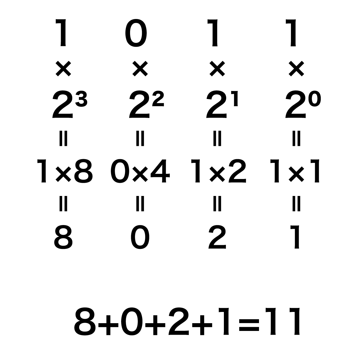 桁の重み 右から n番目 3番目 2番目 1番目 10進数 10n-1 102 101 100 2進数 2n-1 22 21 20 16進数 16n-1 162 161 160 変換する2進数、16進数に桁の重みをそれぞれの桁に掛け算して、すべての和を足し算する事によって、10進数に変換できます。