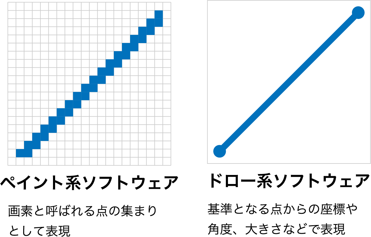 ペイント系ソフトウェア 画像を画素と呼ばれる点の集まりとして表現 ラスタ形式(ラスタグラフィックス) 拡大するとシャギー(ギザギザ)が目立つ ドロー系ソフトウェア 基準となる点からの座標や角度、太さなどで表現 ベクタ形式(ベクタグラフィックス) 倍率に合わせて作画し直すためシャギーは生じない